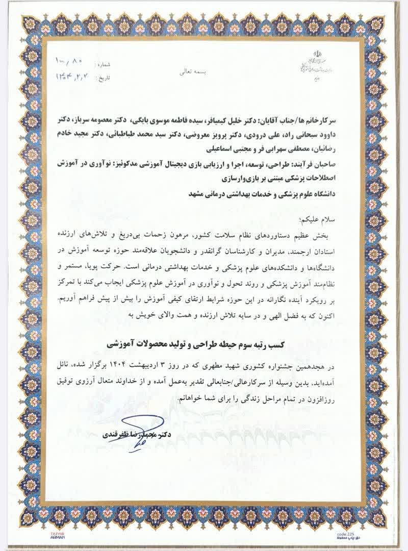 همکار گرامی جناب آقای دکتر خادم رضاییان کسب رتبه سوم حیطه طراحی و تولید محصولات آموزشی را خدمتتان تبریک عرض می نماییم.